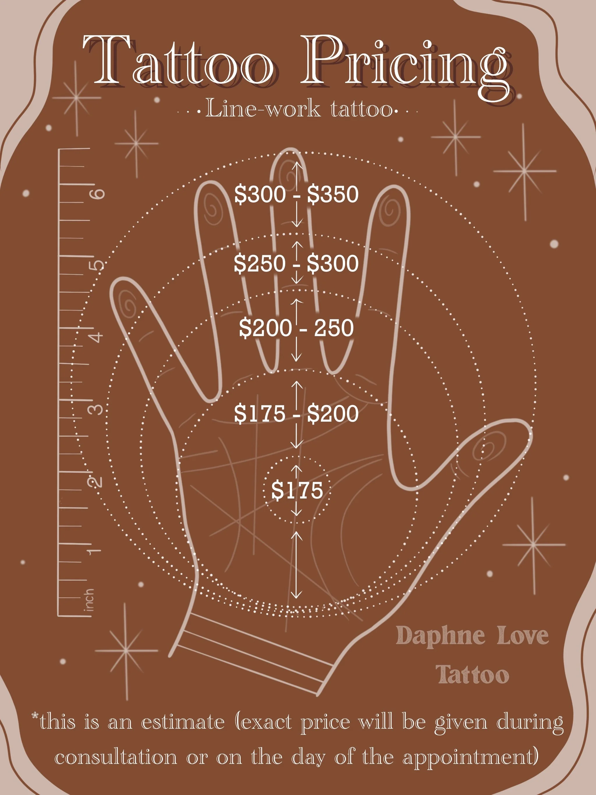 I typically base my rate on how long I think a tattoo will take me (including shop fees, design, set up, break down, supplies, paperwork, bandaging, etc.). The shortest appointment time I book is one hour, and my hourly rate is $175. Therefore, my minimum to book an appointment is $175. If you want to get multiple small tattoos in one appointment (that can be completed within the hour appointment slot) they still may be minimum price in total. I have general pricing charts below. For a more accurate quote I suggest booking a consultation or reaching out through email at daphnelovetattoo@gmail.com.